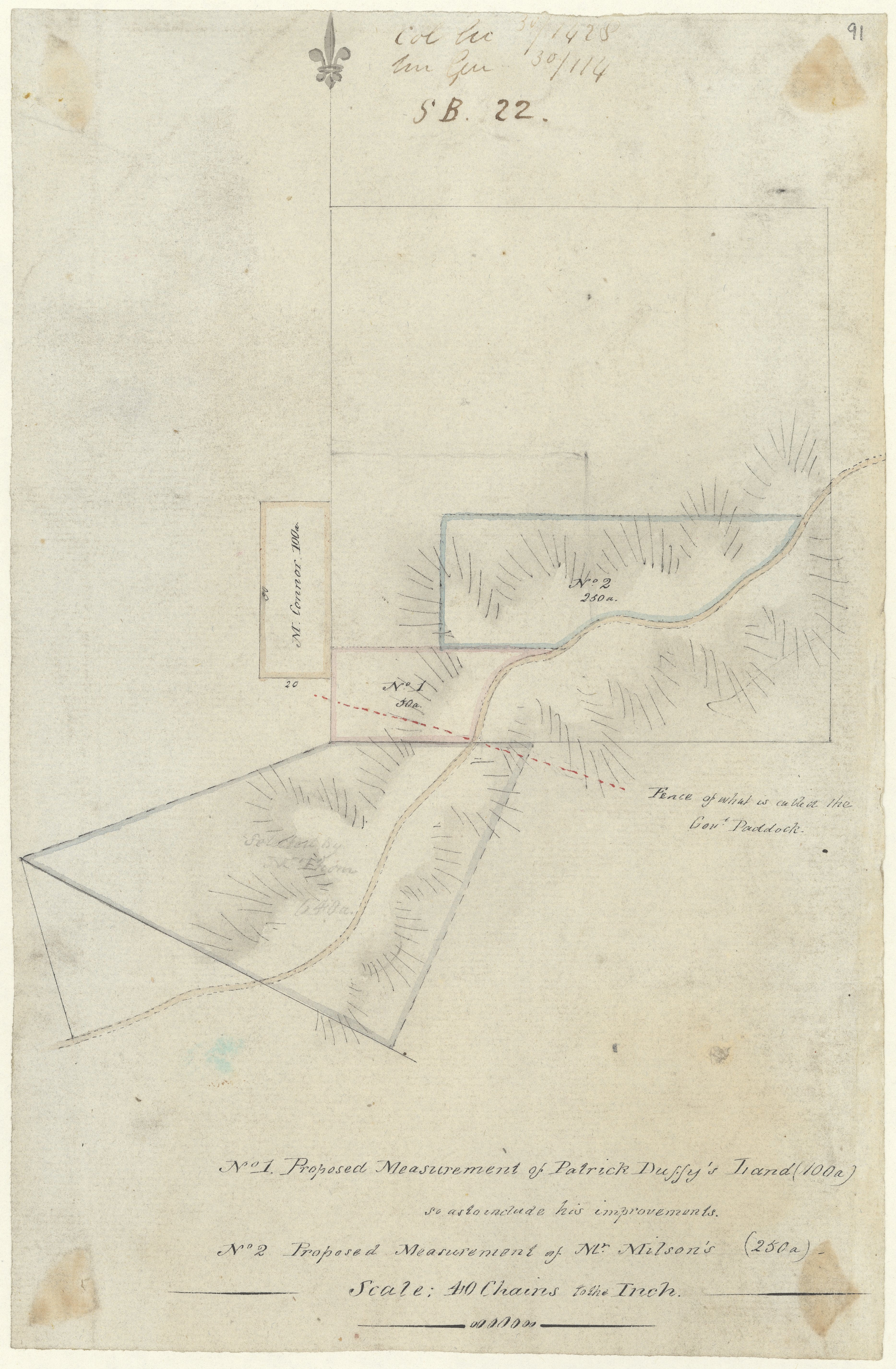 Cumberland Colah South - No. [Number]1 Proposed measurement of Patrick Duffy's land (100a [acres]). No.[Number] 2 proposed measurement of Mr Milson's (250ac [acres]). [Sketch book 1 folio 22]. Courtesy NSW Records and Archives, Item; FL208183
