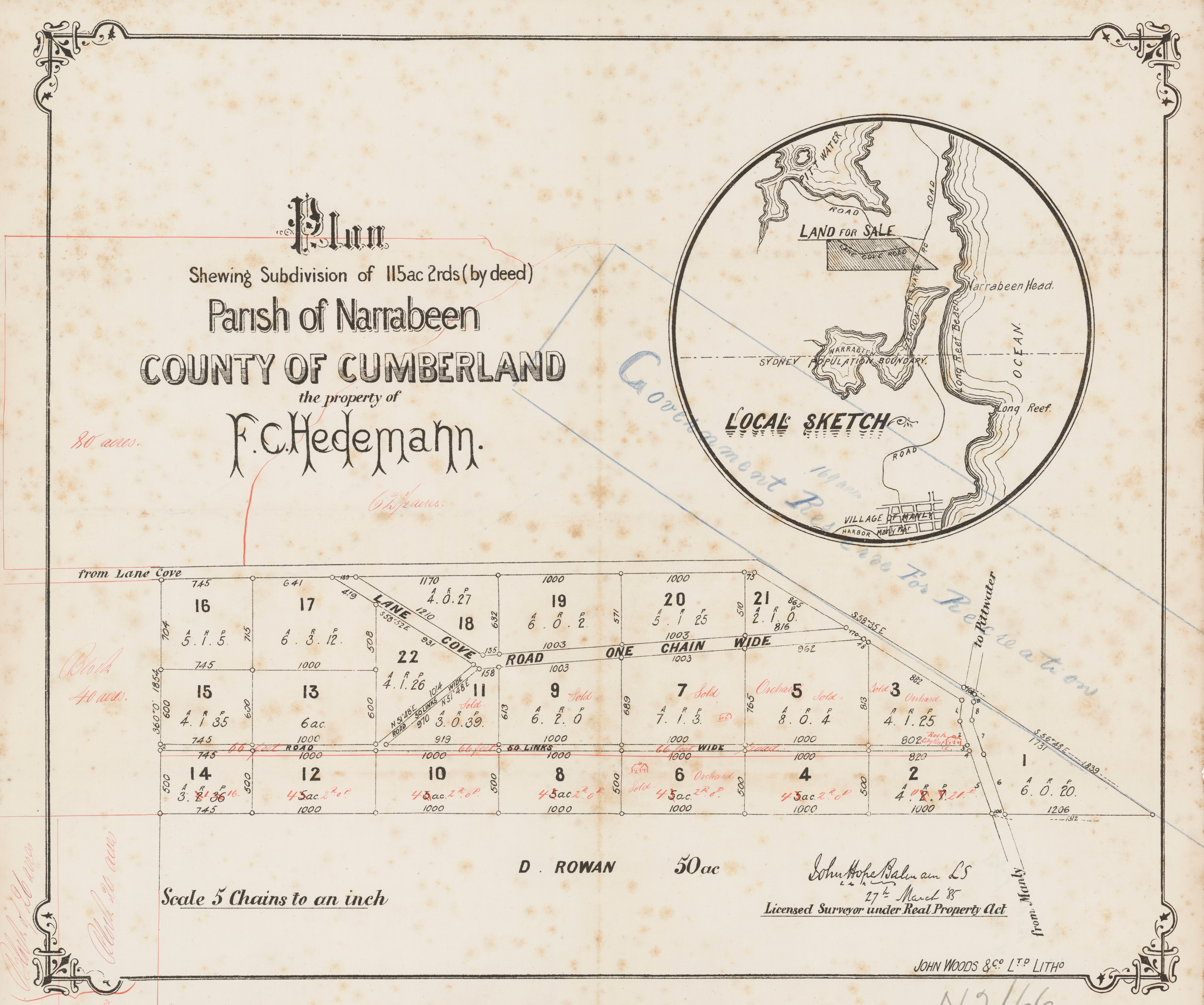 Plan shewing subdivision of 115 acres 2rds (by deed), John Hope, Balmain Surveyor, surveyed 27th of March 1885. Parish of Narrabeen - The Property of F. C. Hedemann. Item No.: c050370068