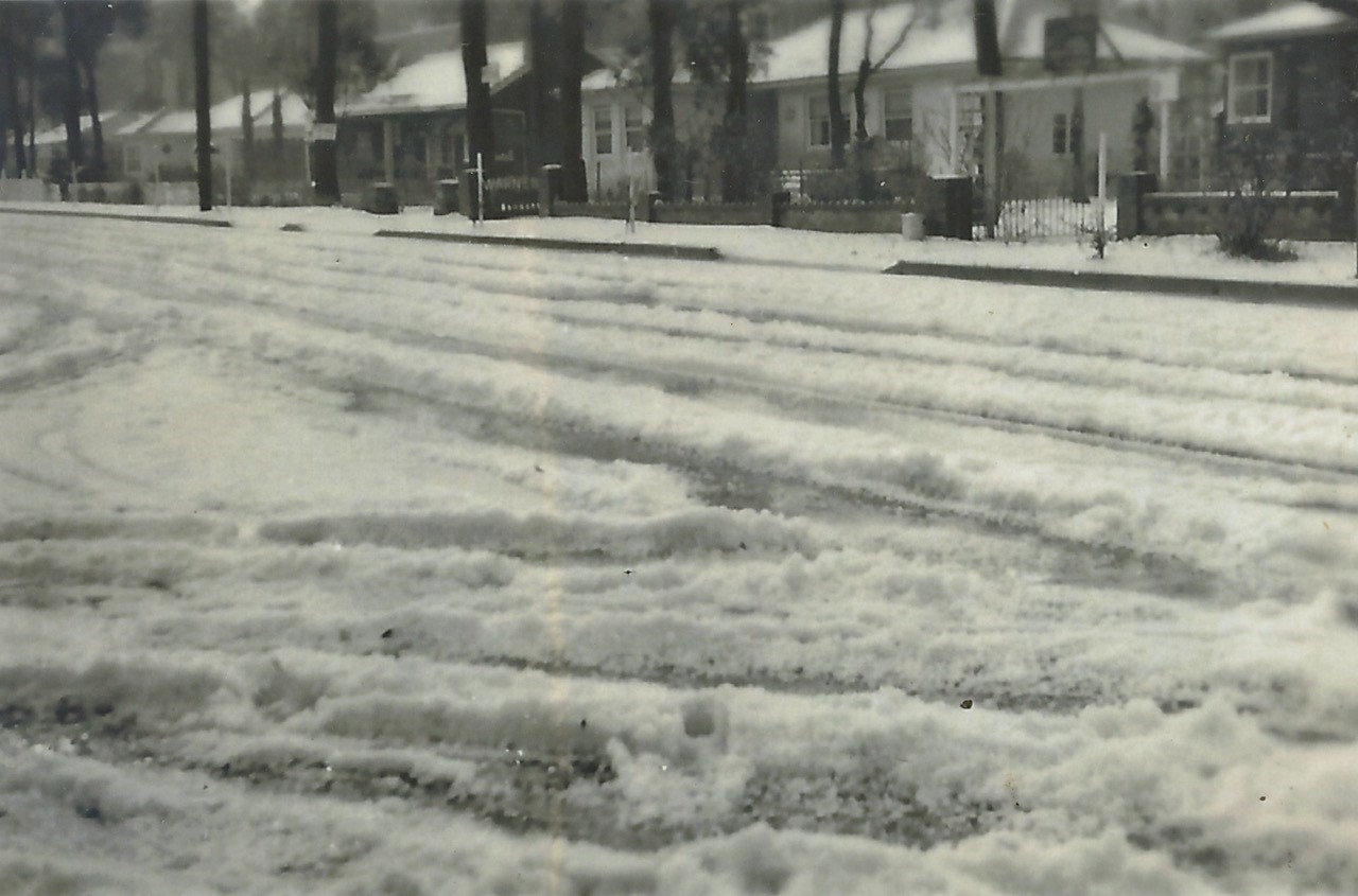 ''My sister remembers this hail storm in June 1956. She and my mother drove down to pick up our brother from the cinema in Avalon. You can see her Armstrong Siddely car parked outside the butcher on the corner.'' - Jane Durham