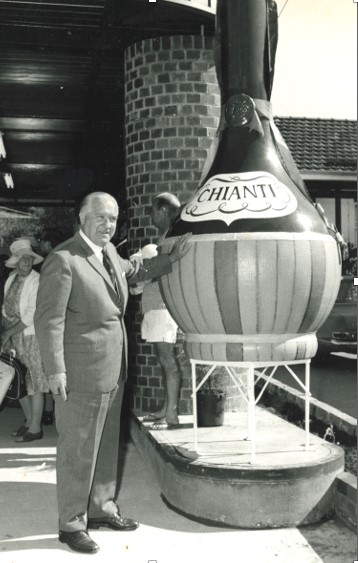 This 3.5 metre high Chianti bottle was sculptured by John from fibreglass at Bill McDonald’s request for his new Drive-in Bottle Shop in Old Barrenjoey Road, almost next to the old Totally Toms. Here’s Sir Robert Askin, former MP for Collaroy and first MP for Pittwater, opening the show.