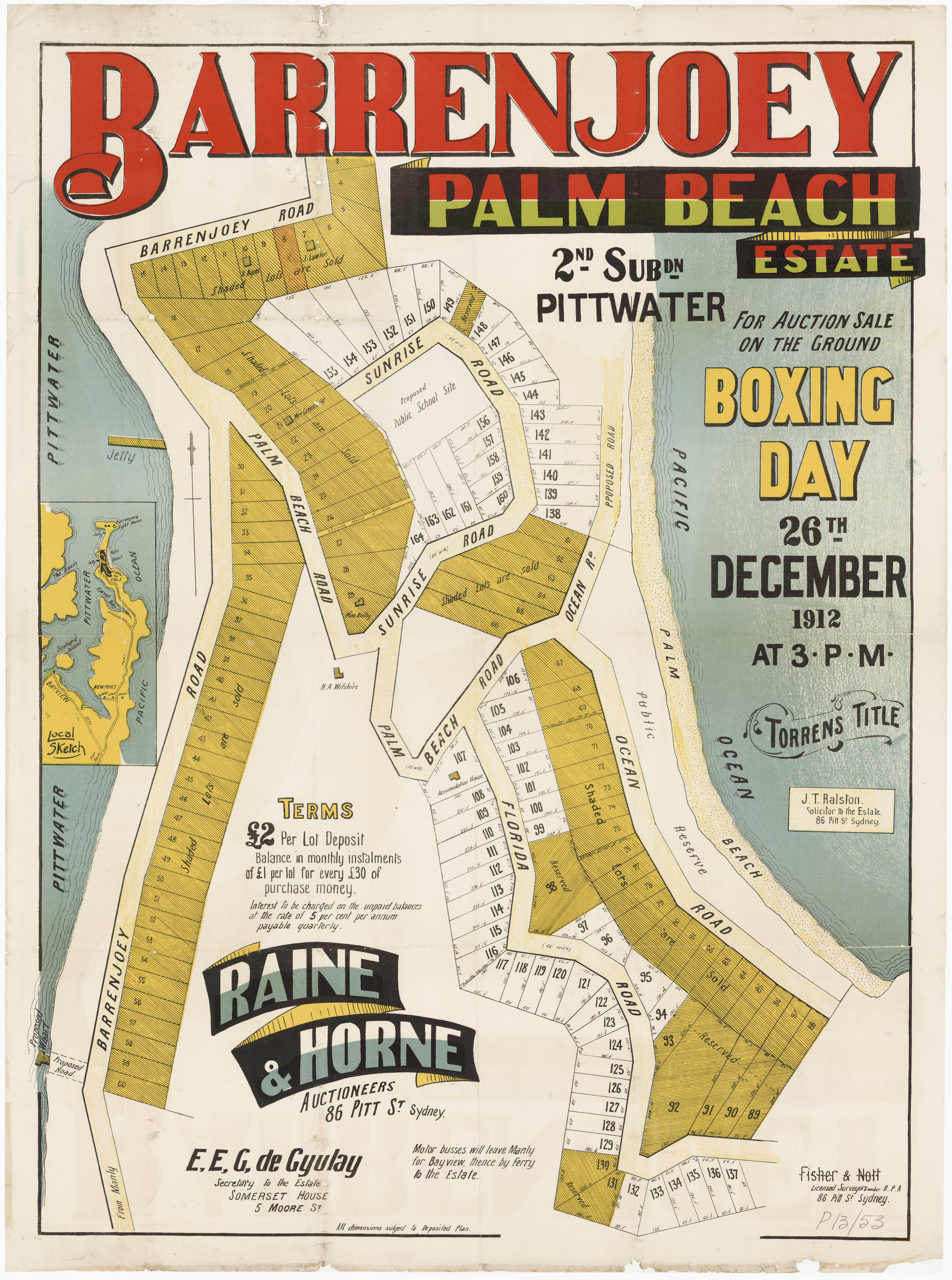 One of the most successful sales ever held in the Barrenjoey district took place on Anniversary Day when the ‘’Palm Beach Estate’’ was offered at public auction by Messrs. Raine and Horne. There was very keen competition for the beach lots which sold from 38/ to 64/ per foot. Every allotment in the estate, which comprised 84 blocks, was cleared and the auctioneer received instructions from the vendors to prepare another subdivision, which will be offered at about Easter. The total sales, including the cottage, realised £2611. BARRENJOEY. (1912, January 30). The Daily Telegraph (Sydney, NSW : 1883 - 1930), p. 10. Retrieved from http://nla.gov.au/nla.news-article239055782