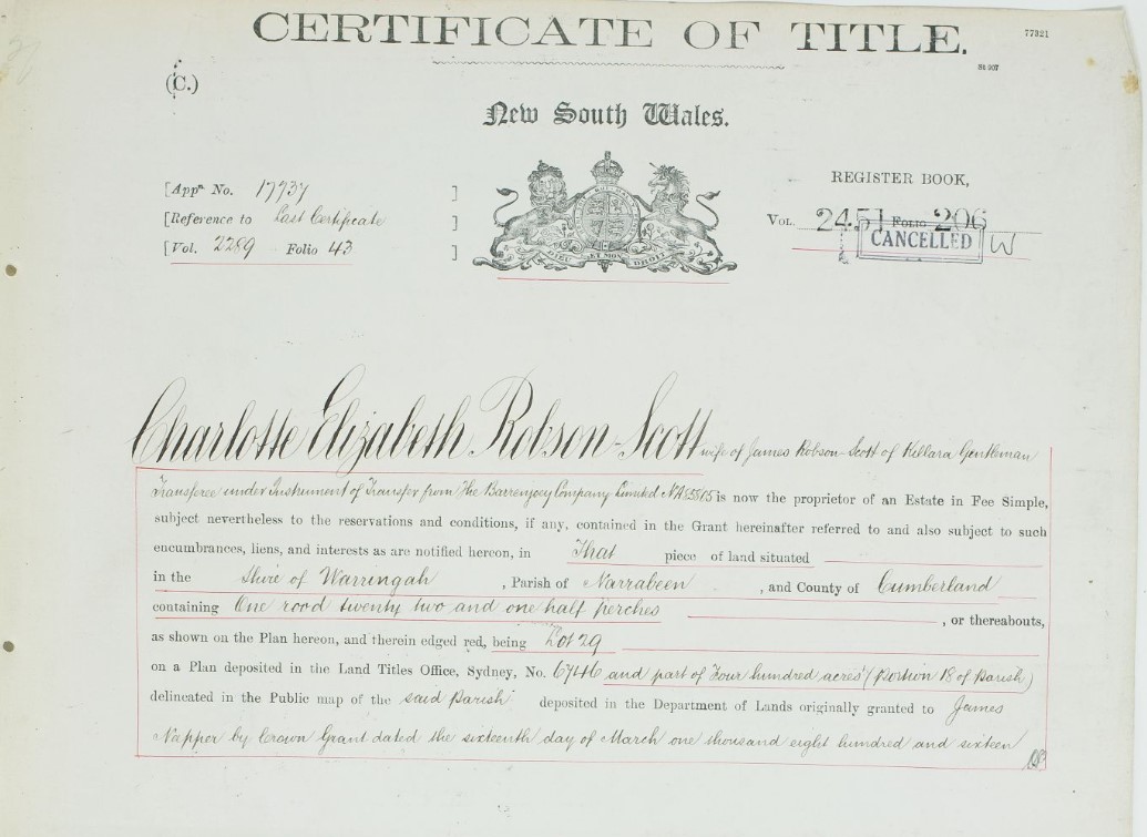 Barrenjoey Company Ltd - Vol. 2289 Folio 43 – December 1912 on