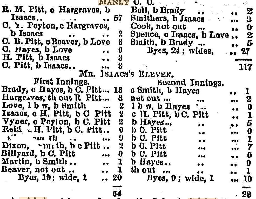 A match was played at Manly Beach on Saturday, the 18th instant, between the Manly C. C. and an eleven gentlemen from Sydney, captained by Mr. F. Isaacs, which resulted in favour of the former in one innings and twenty-five runs to spare. Appended is the score :