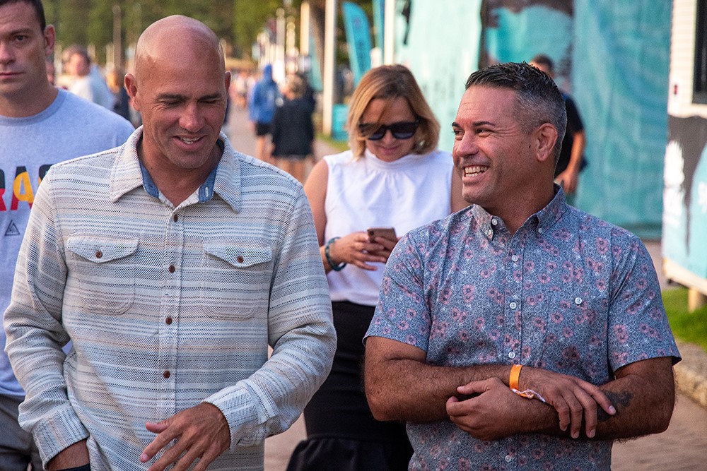 ABOVE: Surfing NSW has announced the inaugural Aloha Award in Memory of John Shimooka. Here is John pictured with 11-times World Champion Kelly Slater in Manly in 2019. Photo: Ethan Smith / Surfing NSW