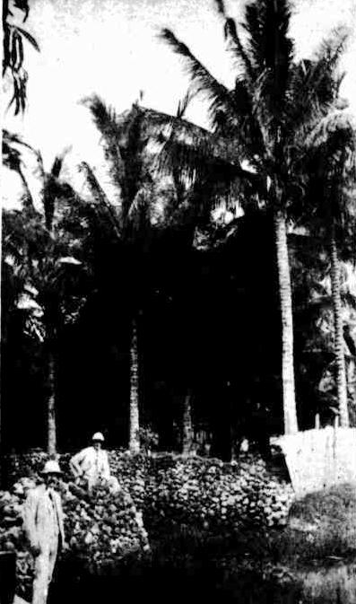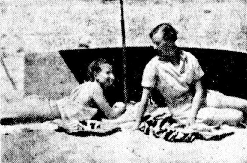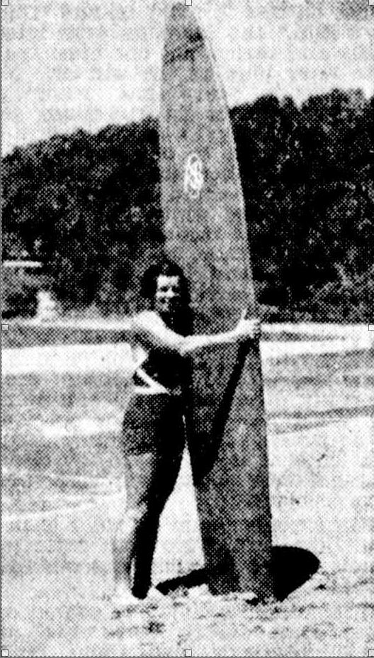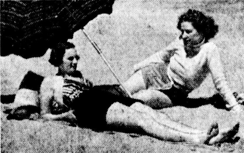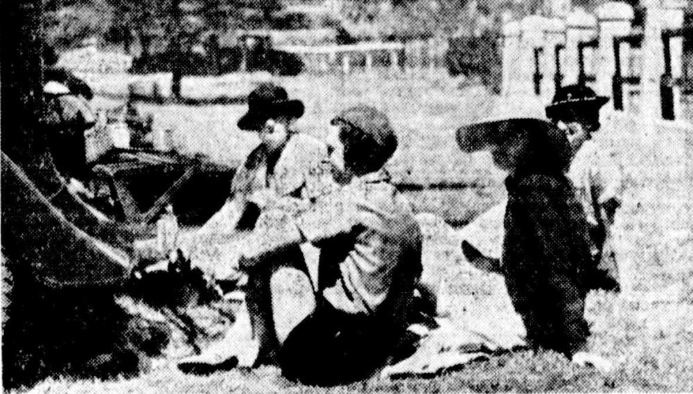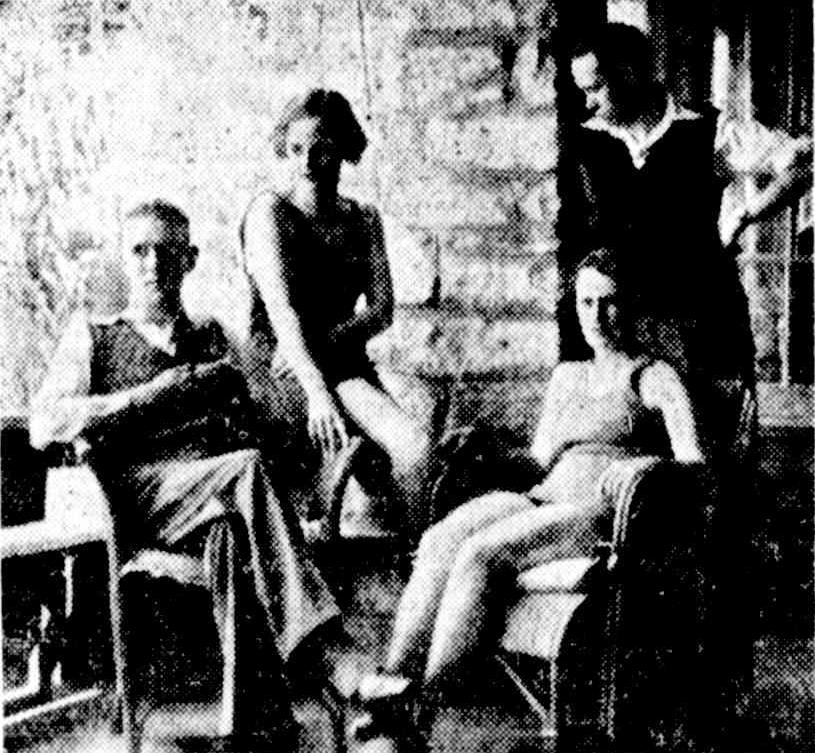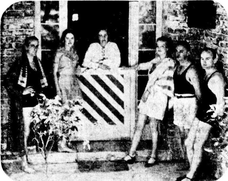 The Peters' home in Beach Rd (now PBSLSC) is one of the most outstanding. Mr. Peters, who is the engineer of Burrinjuck fame, bought the land long before he built the house. During the war years he considered it would not do to build, so the family camped on the land in a most complicated and wonderful system of tents—tents which were far superior to most seaside cottages for comfort. The McKays' home is particularly noted for its lovely garden, perfectly kept. The first frangipanni grown at the Beach was in this garden. Mr. Weldon, who owns "The Moorings," is so fond of gardening that he will even drive, after a rush day at the office, all the way to the Beach to plant a baby staghorn. Previously, however, an even more romantic owner lived in "The Moorings," the late Mr. Walter Lipscomb. He had the nameplate of this, the first bungalow built at Palm Beach (by an American architect, with keystone to the chimney piece by Theo Cowan), "moored" to a tree, not the fence, as it is at present, and the verandah not comfortably closed in as now with glass and awnings, but open to the four winds.