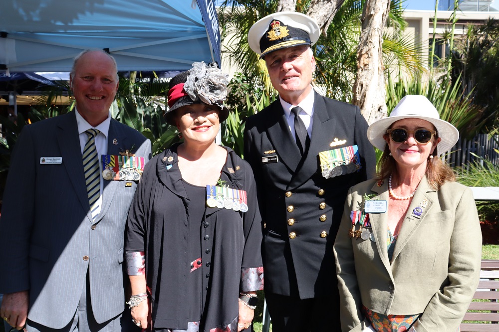 Commodore Richard Menhinick, AM, SCS, RAN, re’td, President of Avalon Beach RSL Sub Branch, RAN Lieutenant Commander Tamara Sloper-Harding OAM, Vice-President Avalon Beach RSL Sub-Branch, RADM Lee Goddard CSC RAN (Retd), Deborah Carter, President Pittwater RSL Sub Branch - photo taken after conclusion of 2026 Commemorative Service