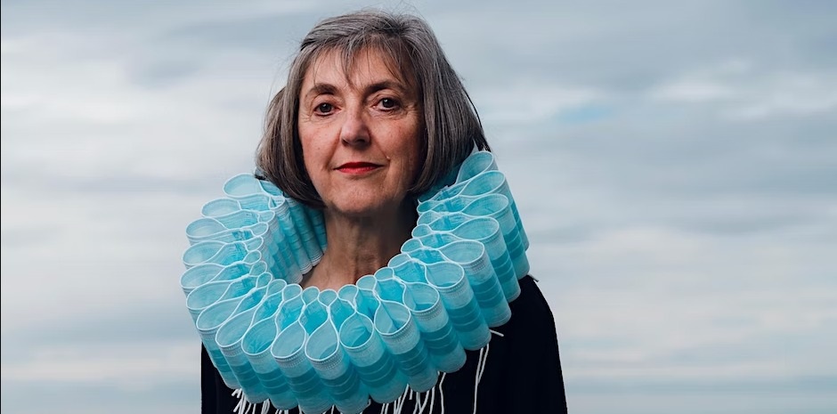 The 30 wearable artworks were crafted from computer keyboard parts and adaptors, airplane headsets, discarded razor blades, used coffee capsules, disposable face masks, bra underwires, wire springs, beer bottle caps, single use toiletries, cosmetics, pens, garden hose, coat hangers, disposable spoons, lightbulbs, rubber bands and many other everyday items.