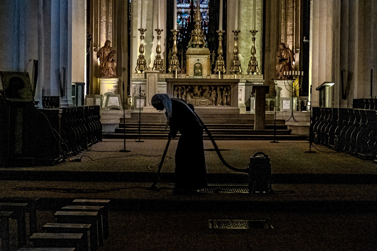 Nun vacuuming