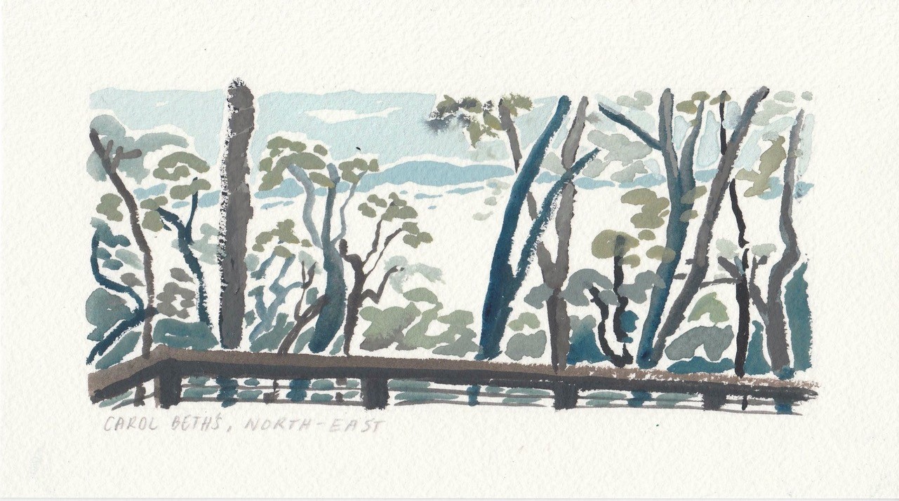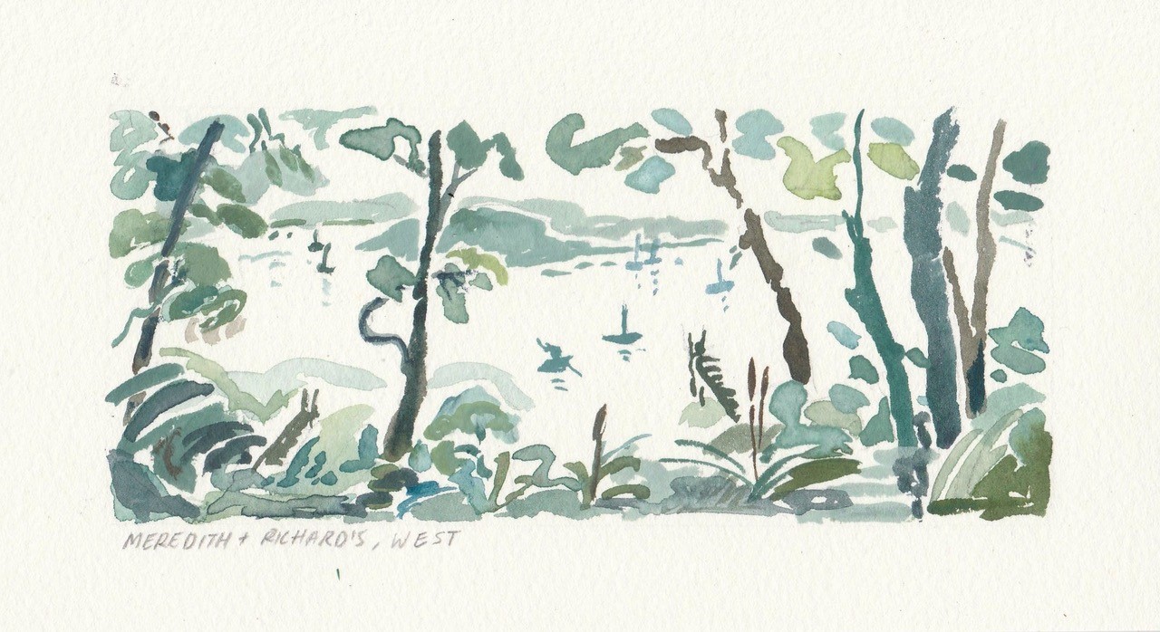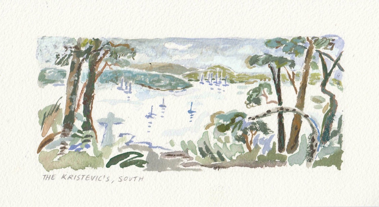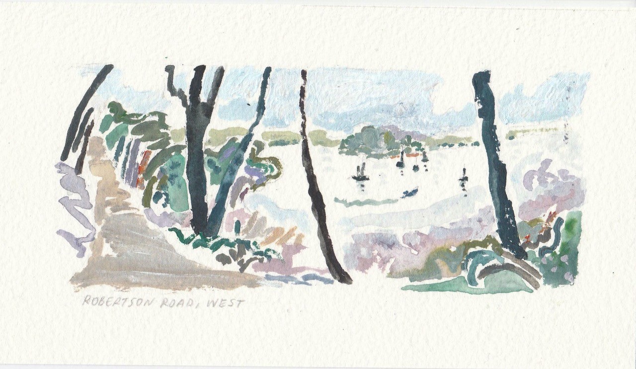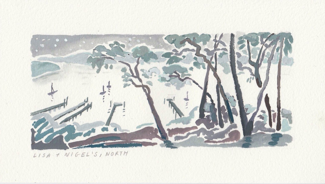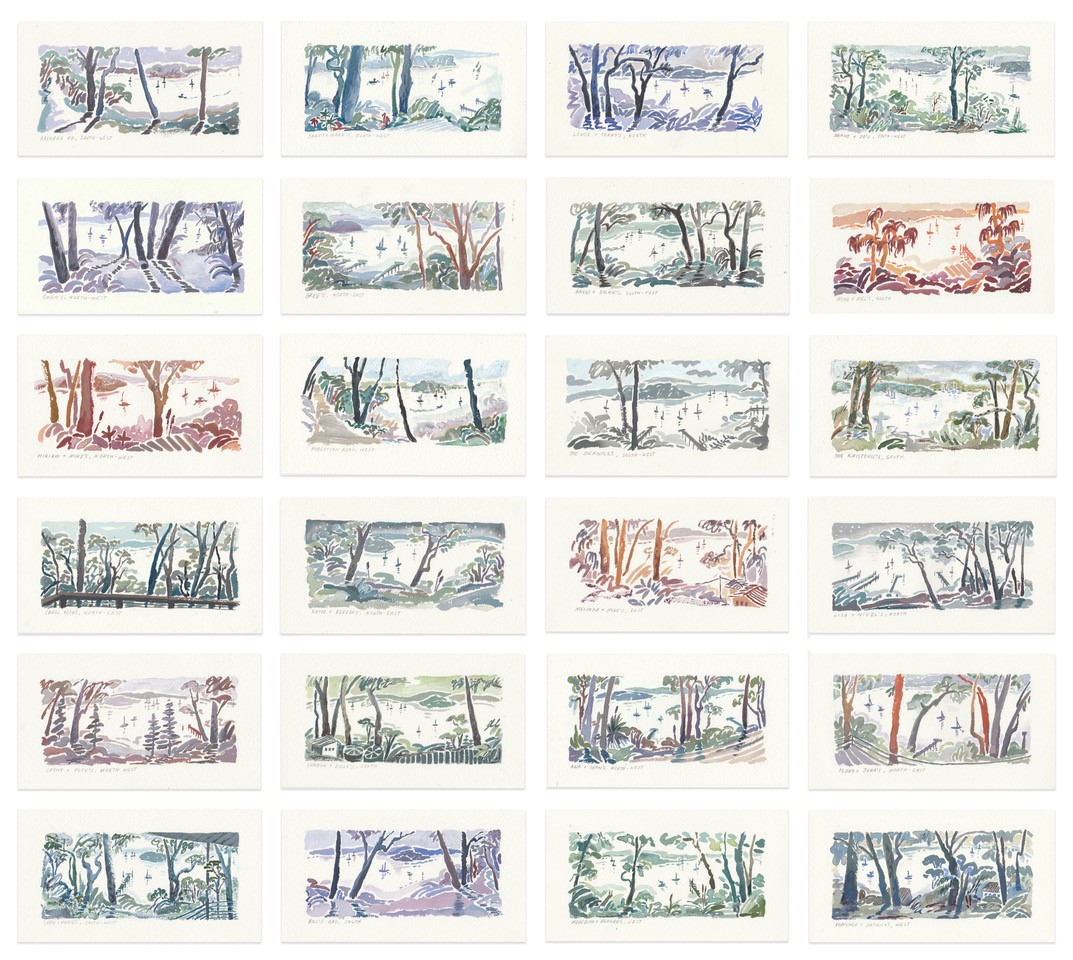 I wanted to tell a story and the old adage, the easiest story to tell is the one you’re most familiar with was obviously the place to begin. I began with sketches of different perspectives around Scotland Island where I live, visiting friends’ and neighbours’ balconies to draw. From these sketches I made a collection small watercolour and gouache paintings (24 in total) that together formed my artwork.