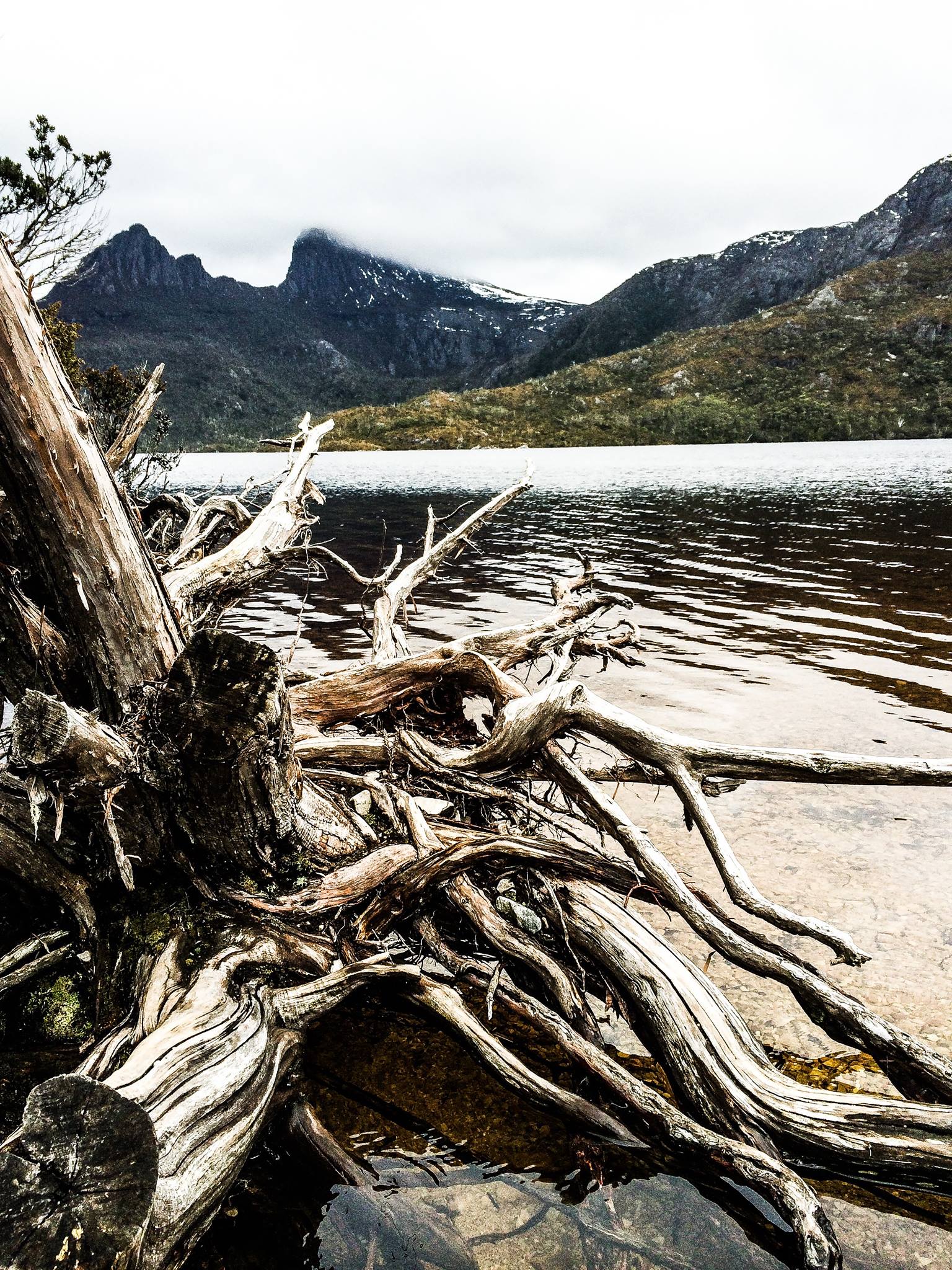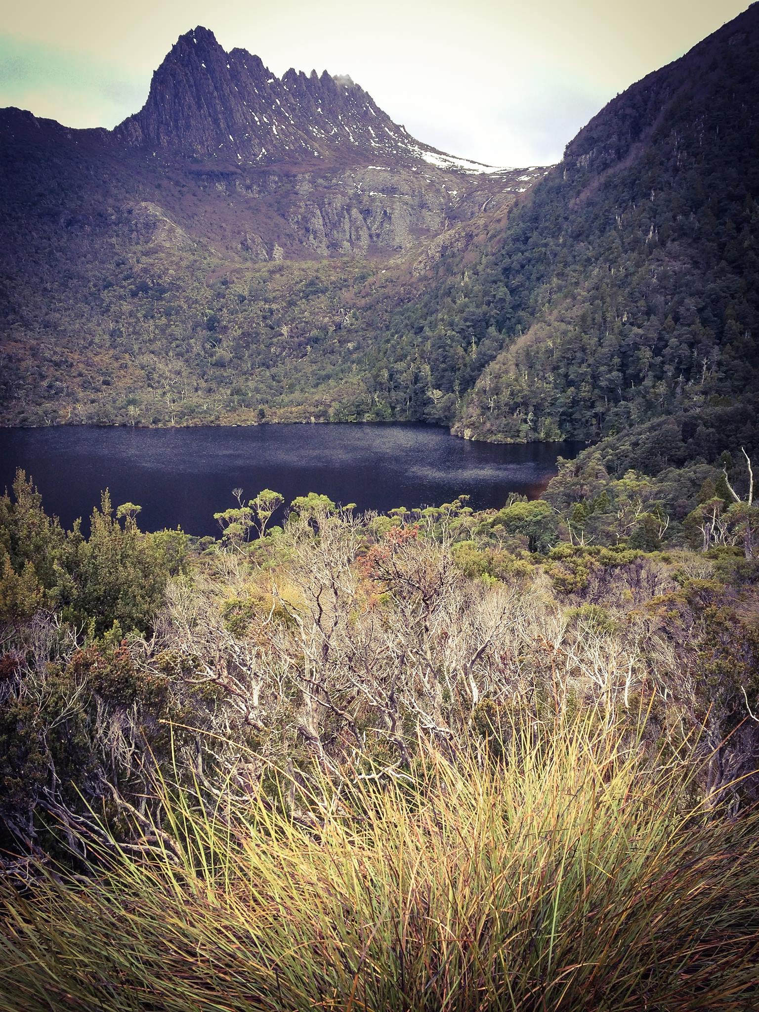Cradle Mountain Tasmania, August 2014. A dark foreboding mountain, standing guard over Dove Lake, it's barren bleak tops occasionally wreathed in low cloud, a scattering of snow here and there. A cold wind cuts across the beautiful alpine landscape. Stunning!