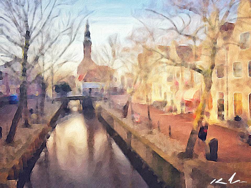 Frozen canal in the village centre, Edam, Netherlands 2016.
