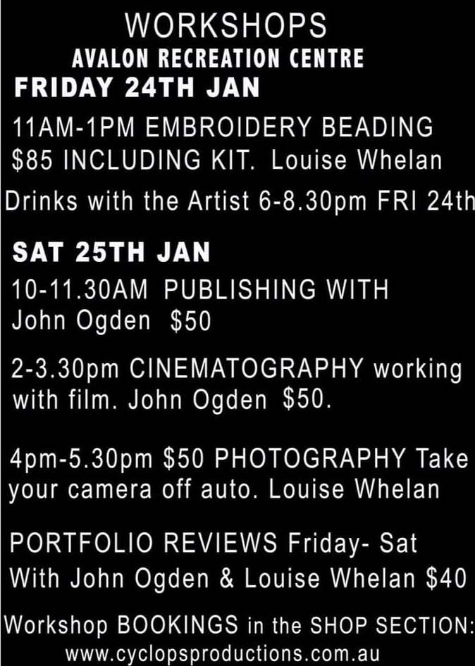 My talented wife Louise Whelan has been awarded a 3-week art residency on the Coast of Kerry, Ireland … and I get to go with her. In preparation for 10 weeks abroad, we have been clearing the house and are having a 2 day exhibition/art sale on Fri 24th and Sat 25 th Jan with scheduled portfolio reviews and a range of creative workshops, including: CINEMATOGRAPHY - working with film workshop; PUBLISHING - how to get your work published; PHOTOGRAPHY - Taking your camera off auto; and an EMBROIDERY BEADING WORKSHOP. Drop in and say hello and have a drink with us on Friday night around 6pm.