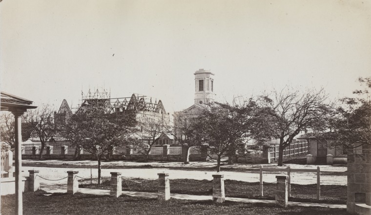 The mulberry trees in front of St George's Church, St George's Terrace and the Perth Town Hall under construction behind, 5 October 1868 - Item: 6909B/47, courtesy State Library of Western Australia