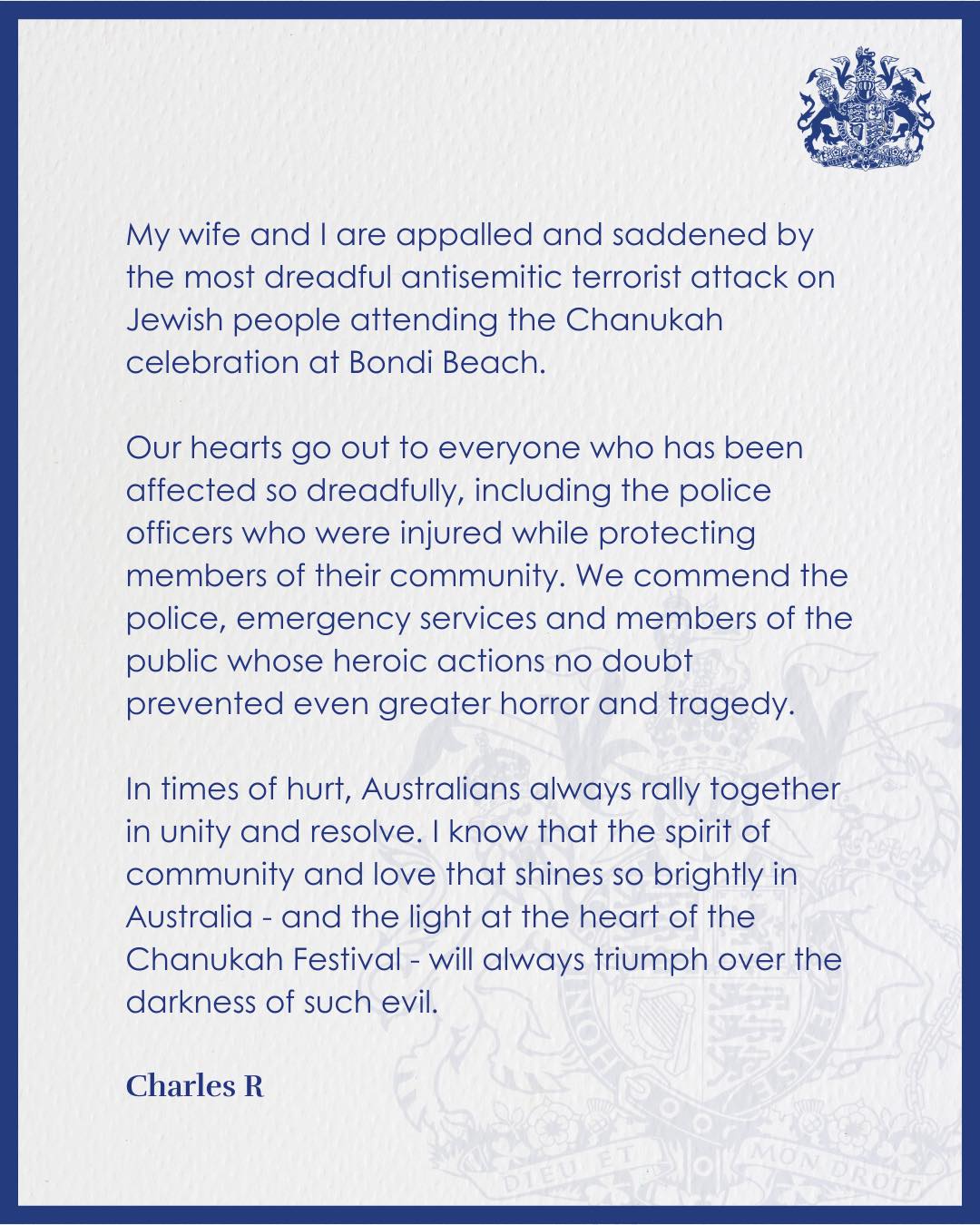 From His Majesty, King Charles III, to the people of Australia following the anti-semitic terrorist attack at Bondi Beach.