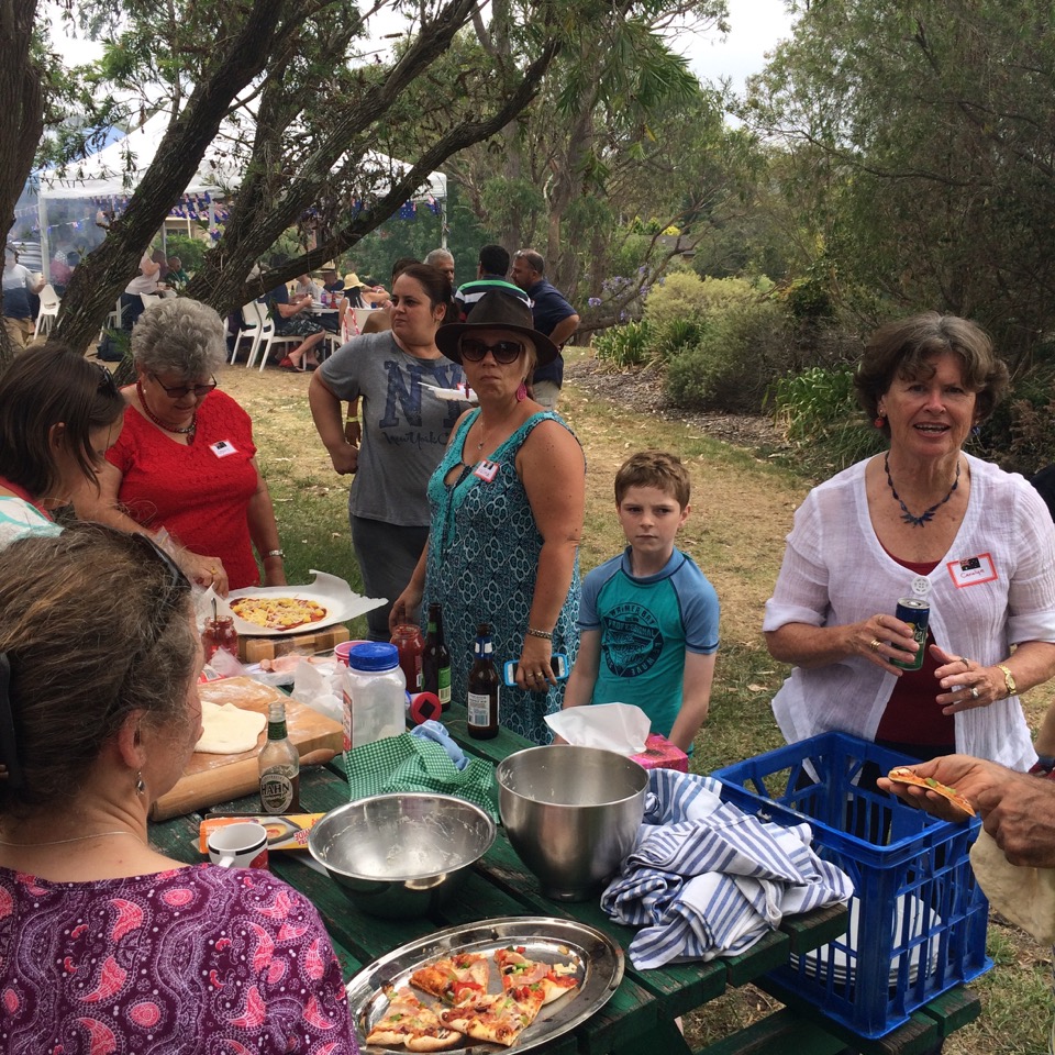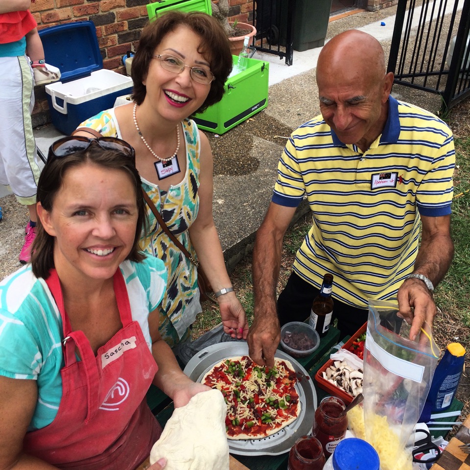 This Australia Day we celebrated with some of the amazing people who have brought this project together – they are Australians with Polish, American, German, Syrian, Armenian, British and European backgrounds, some who have arrived as, or were children of, refugees themselves. Tony BBQ’d some of his stunning home made Merridong Haloumi cheese, his neighbours slow cooked the most tender lamb I have ever tasted, and we learnt some great Armenian and Syrian BBQ tips – including using a hair-drier to get the coals hotter, faster and lining your serving plates with flat bread to soak up all the meat juices. Whilst kids repeatedly launched themselves down a giant slip’n’slide made of sand bags and builders plastic in the park, the pizza oven was fired up and a united nations of volunteers production lined a variety of toppings into a tasty array of toasted treats.