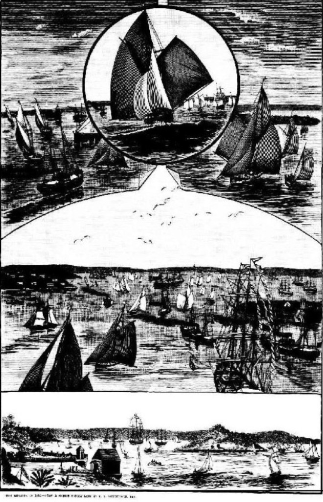 THE REGATTA OF 1853-FROM A SKETCH KINDLY LENT BY E. L. MONTEFIORE, ESQ. Sketch of 1853 regatta; THE CENTENNIAL REGATTA.