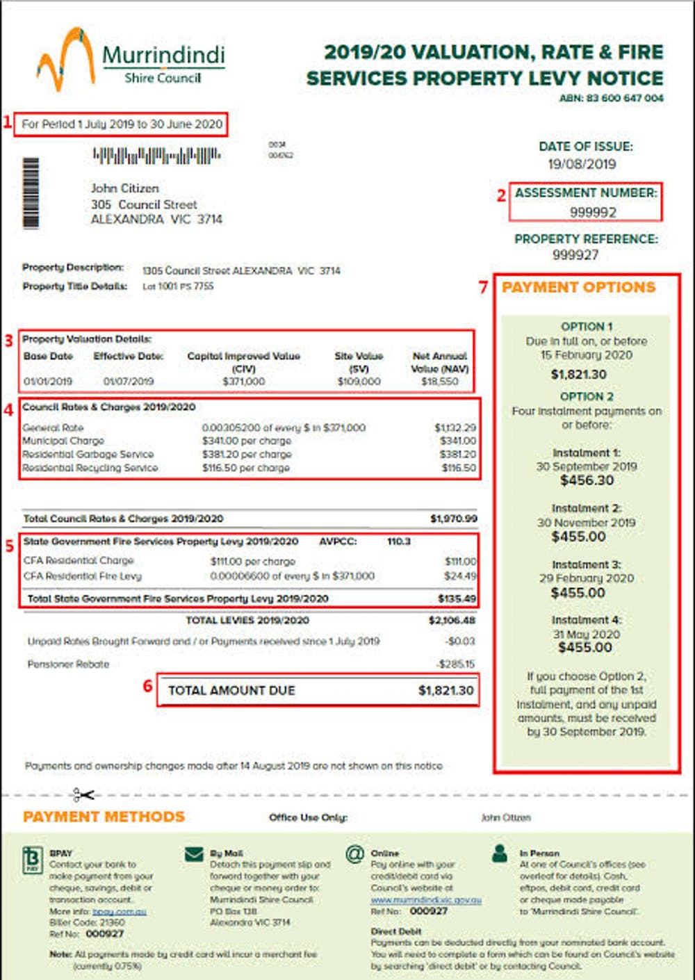 Sample of a rates notice including the fire services levy for Murrindindi Shire Council, Victoria. Murrindindi Shire Council