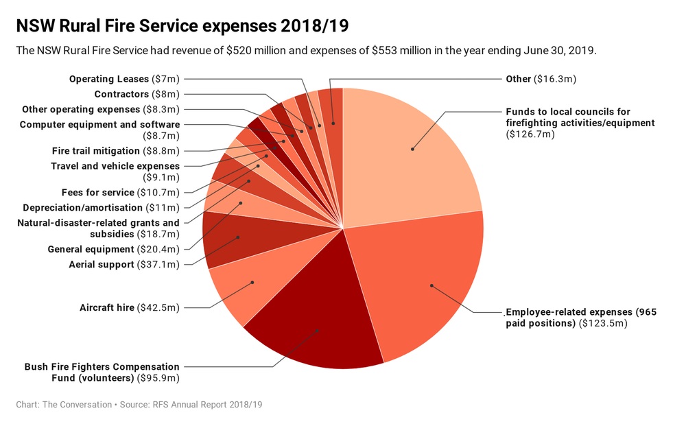 Even though most firefighters in the rural fire services are volunteers, there are still significant costs. The NSW Rural Fire Service, for example, maintains more than 2,000 brigades with their own stations, vehicles and other running costs. It also employs 965 paid staff in administrative and operational roles. Capital investment of $42 million for stations and equipment was made in 2018-19 in addition to running costs.