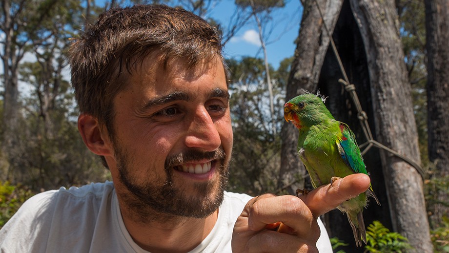 Dr Dejan Stojanovic holds a swift parrot - Photo Supplied: Dr Dejan Stojanovic