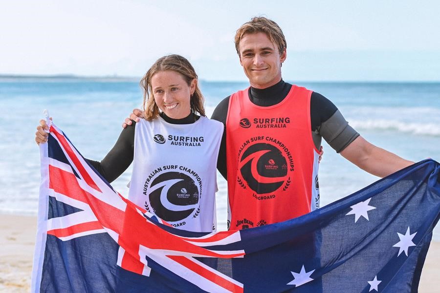 2024 Australian Longboard Champions Tully White (Open Women) and Declan Wyton (Open Men). Credit: Hannah Jessup / Surfing Australia