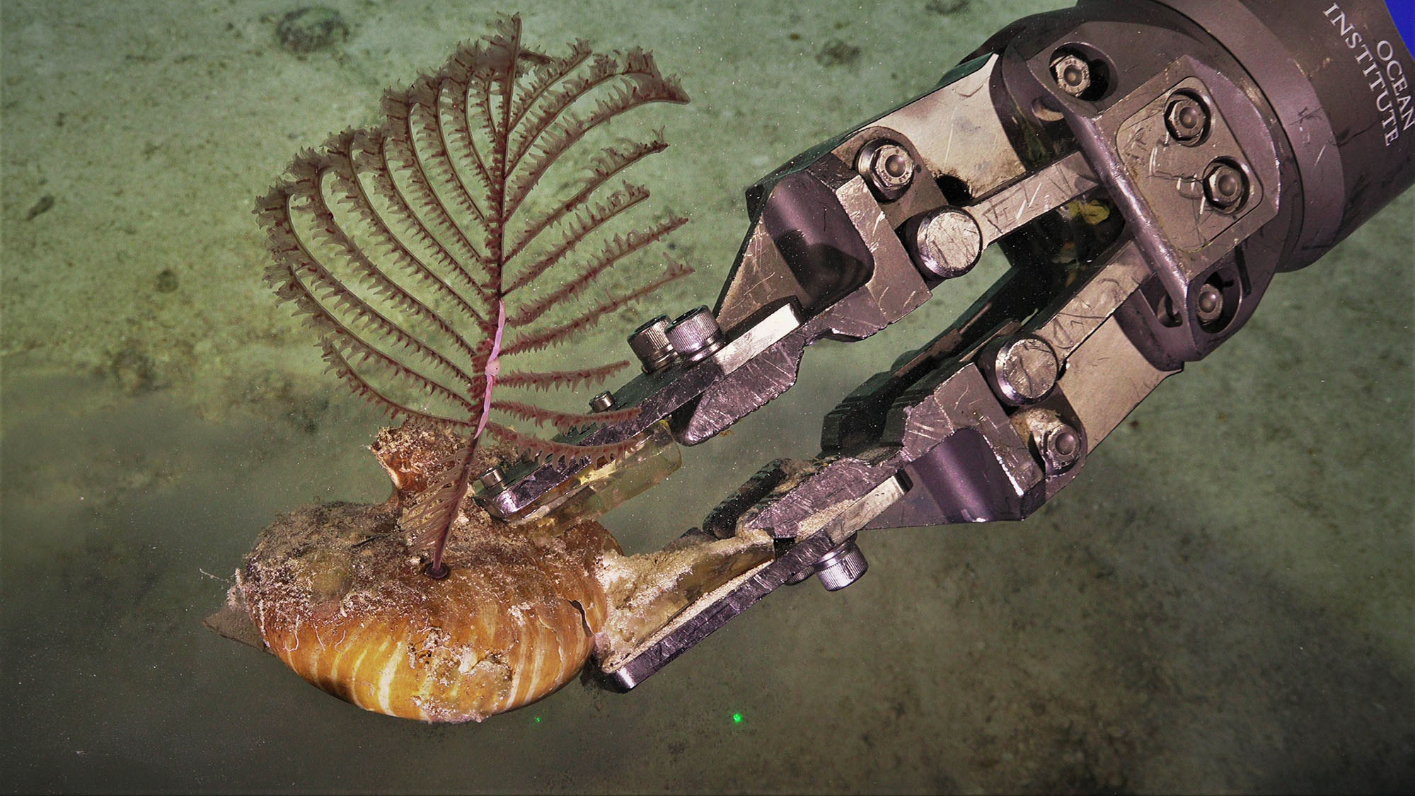 ROV SuBastian’s manipulators gently grasp a black coral growing on a nautilus shell at a depth of 550 meters deep at Herald Cays. This black coral belongs to a family called Schizopathidae; however, experts suspect the genus might belong to an entirely different family. With this complete specimen researchers will finally be able to extract and sequence its DNA, comparing it with species from both families to see to which family it is most closely related.