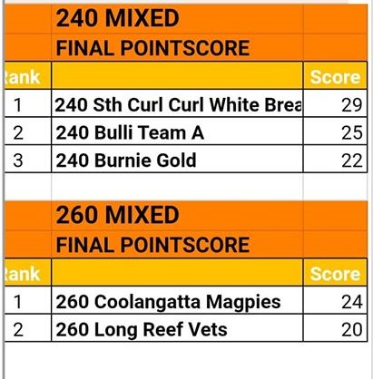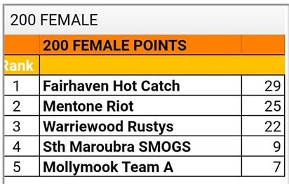 Surf Life Saving Sydney Northern Beaches Branch Under 23 Newport 'Thunder' won bronze with Palm Beach's Piranhas placing 4th. The Warriewood Rustys secured bronze medals in the 200 Female Masters with the Long Reef Vets taking silver in the 260 Mixed Masters Division.
