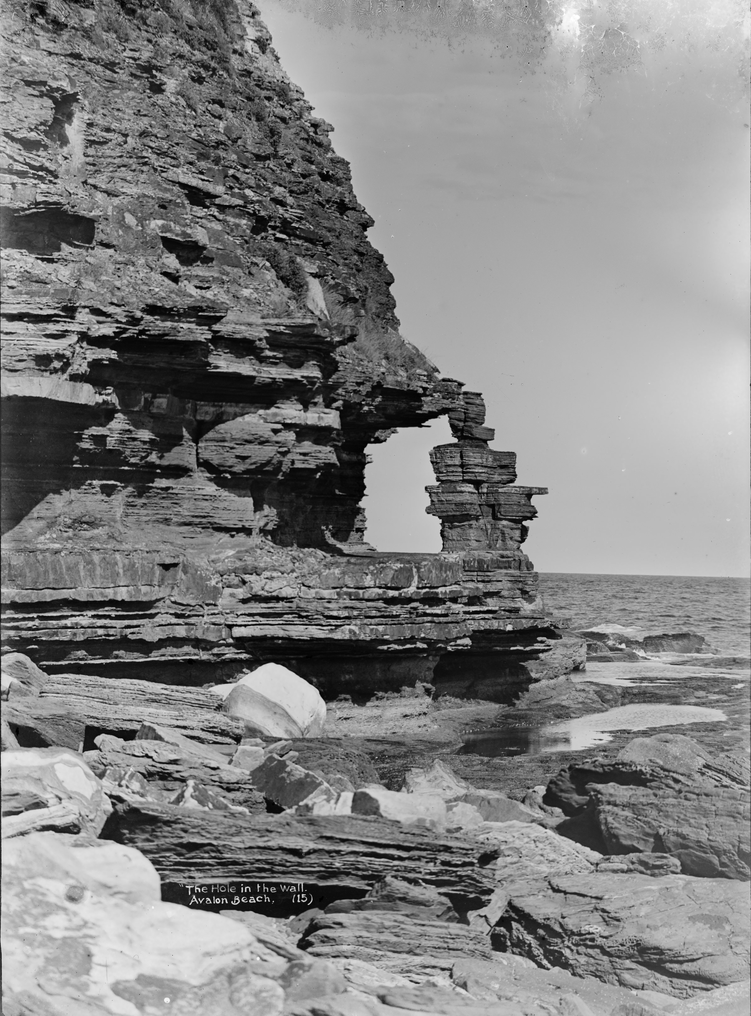 Illustrations/photos: The Hole In The Wall, Avalon Beach (also once called St. Michael's Arch) - ON 165/929 Item No.: c07771_0006_c - photo by Rex Hazlewood, Image Courtesy The Mitchell Library, State Library of NSW; showing the Indian Head silhouette of North Avalon headland - taken 24/6/2016 - A J Guesdon photo and remembering that this geological feature fell in 2017, changing that coastal cliff face ;