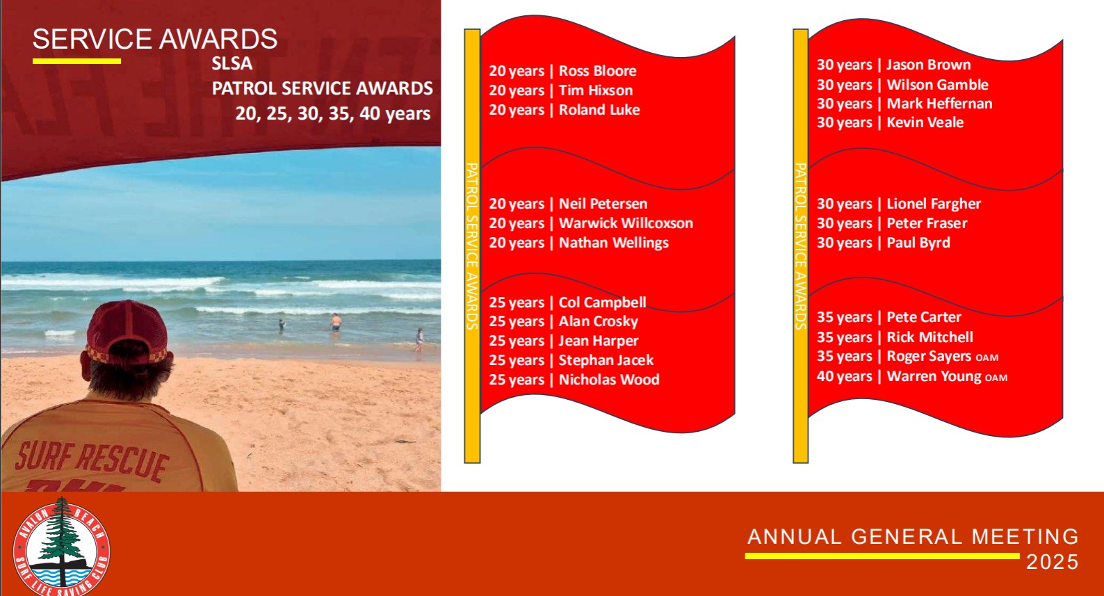 Numerous Awards for years of service presented by Peter Agnew AM President of Surf Life Saving NSW.