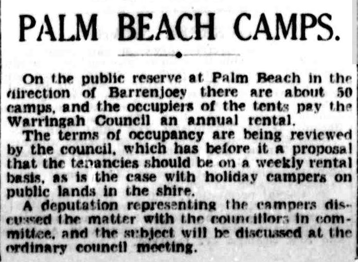 PALM BEACH CAMPS. (1940, February 29). The Sydney Morning Herald (NSW : 1842 - 1954), p. 10. Retrieved from http://nla.gov.au/nla.news-article17660518