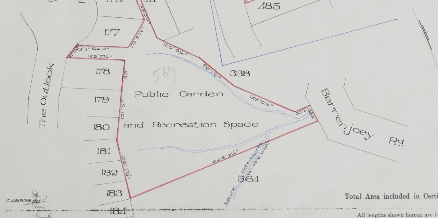 The NSW HRLV provides under Volume 4828, Folio 108 from when Angophora Reserve was handed to the community by A J Small - note the marked water courses, or creeks::