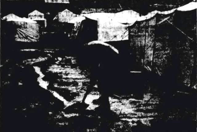 Everything is bedraggled — the tents, the women, the children, the cats, the pitiful flowers pining in the sterile sand. In a 12-by-12 tent-; humpy on Third Avenue lives Mrs. D. Hudson and her eight children; youngest five months, eldest 12 years. Her husband doesn't live there any more. The storm-rent walls of her tent gape open and her ceiling has a good view of the stars. In a partitioned corner, a huddle of double-bunks gives everybody a bed or part thereof, and the "living room" has a bare table, a chair, a kerosene cooker, and a heap of pots and pans. The family gets by on child endowment and a 30/ weekly grocery order from Social Services. .