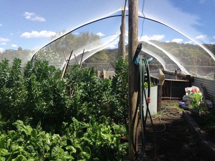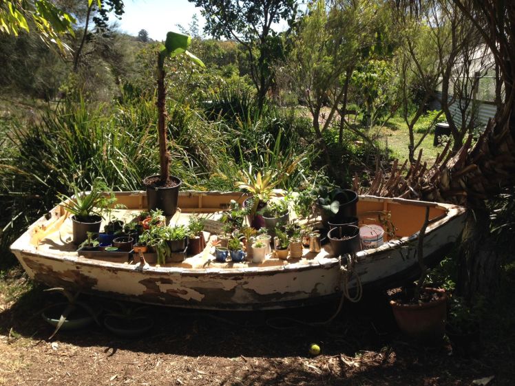 The garden has changed and developed over the years and is broken into many separate areas, including an indoor netted zone for plants and vegetables that are most susceptible to pests, a composting zone, broken into various composting stages, worm farms, a chook house/palace for the three resident hens, and various sections, raised beds, veggie pods, and recycled boats, baths, and bric a brac that have been turned into great beds for growing seasonable vegetables.