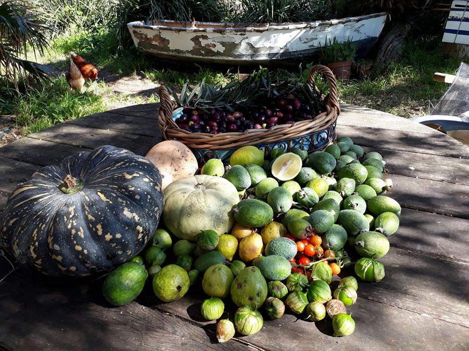 April 16, 2017: Today's harvest. Basket full of olives, pumpkins, fejoas, guavas, tomatillos, lemons, limes and tomatoes.