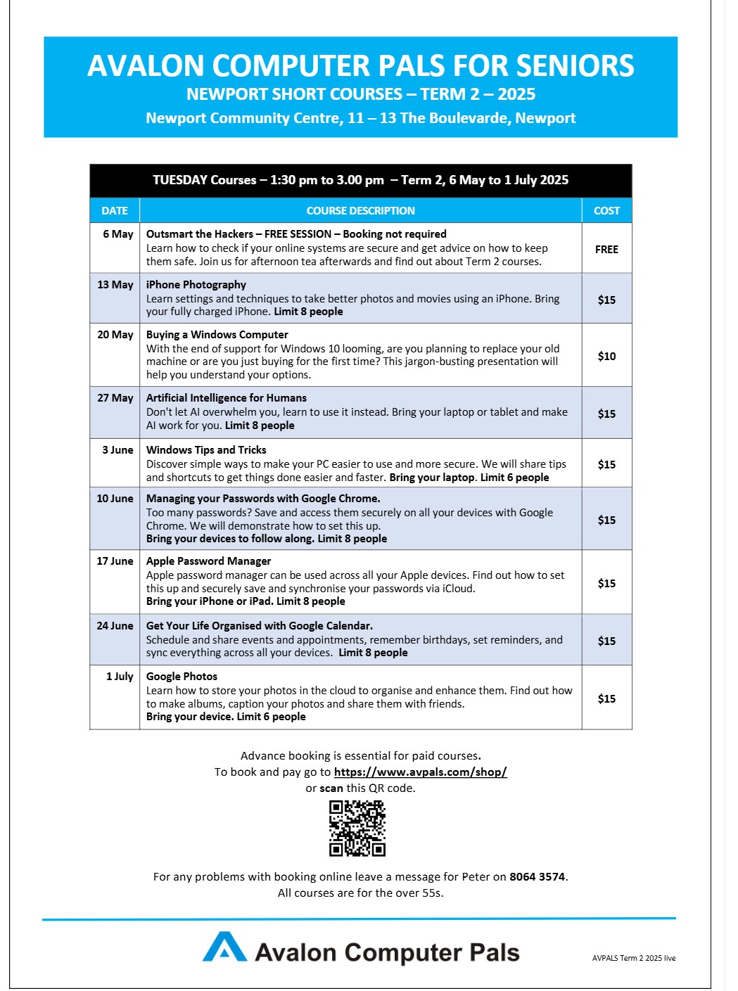 In 2012, Avpals broadened its activities to provide lectures and small-group workshops at the Newport Community Centre one afternoon a week during school terms. These have proved very popular and cover topics such as iPhones, photography, internet security, travelling with technology, and many others.