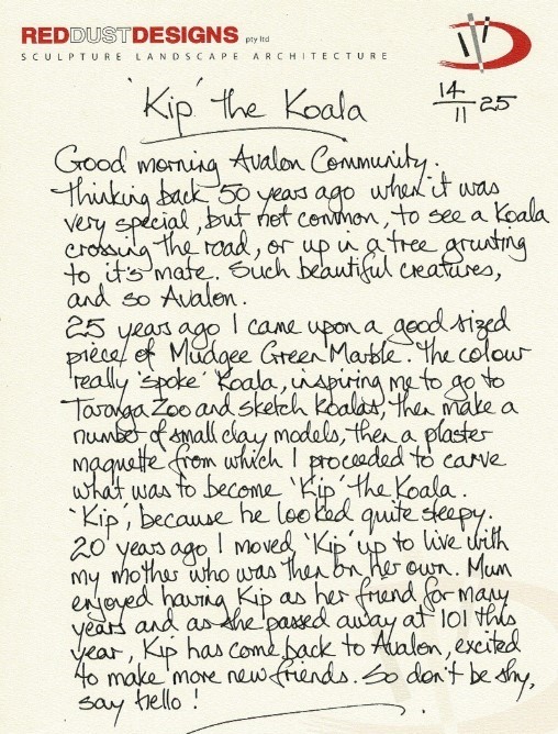 The excellent sculptor and landscape architect, Richard Stutchbury gave Nura Djaroba a stunning green marble koala called ‘Kip’ in memory of the many koalas which used to live in the local area.