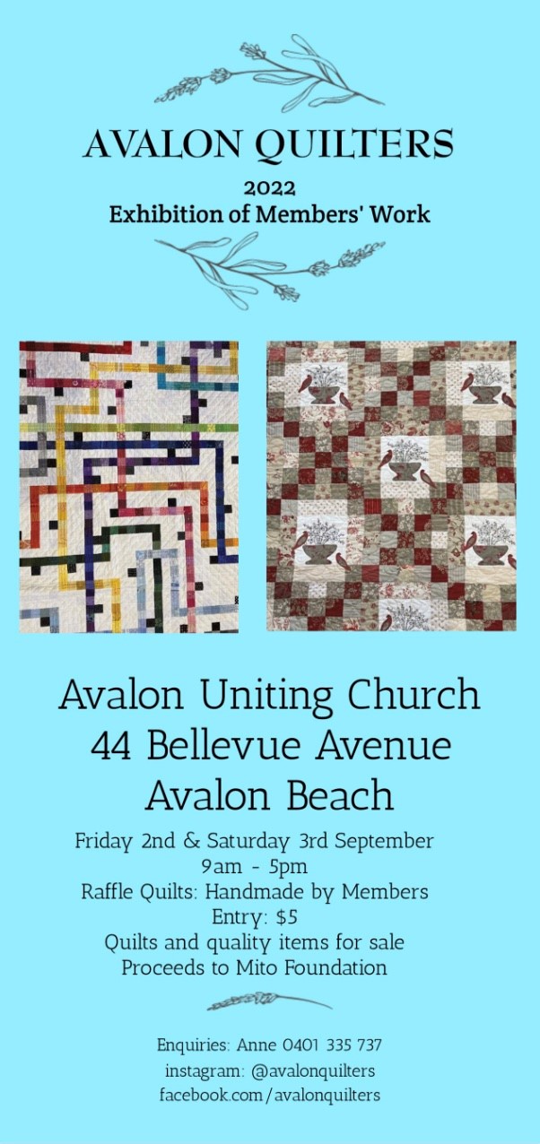The 2022 Avalon Quilters Exhibition of Members Work will take pace in the Avalon Uniting Church, 44 Bellevue Ave, Avalon Beach, on Friday and Saturday September 2-3, 2022 from 9am to 5pm both days