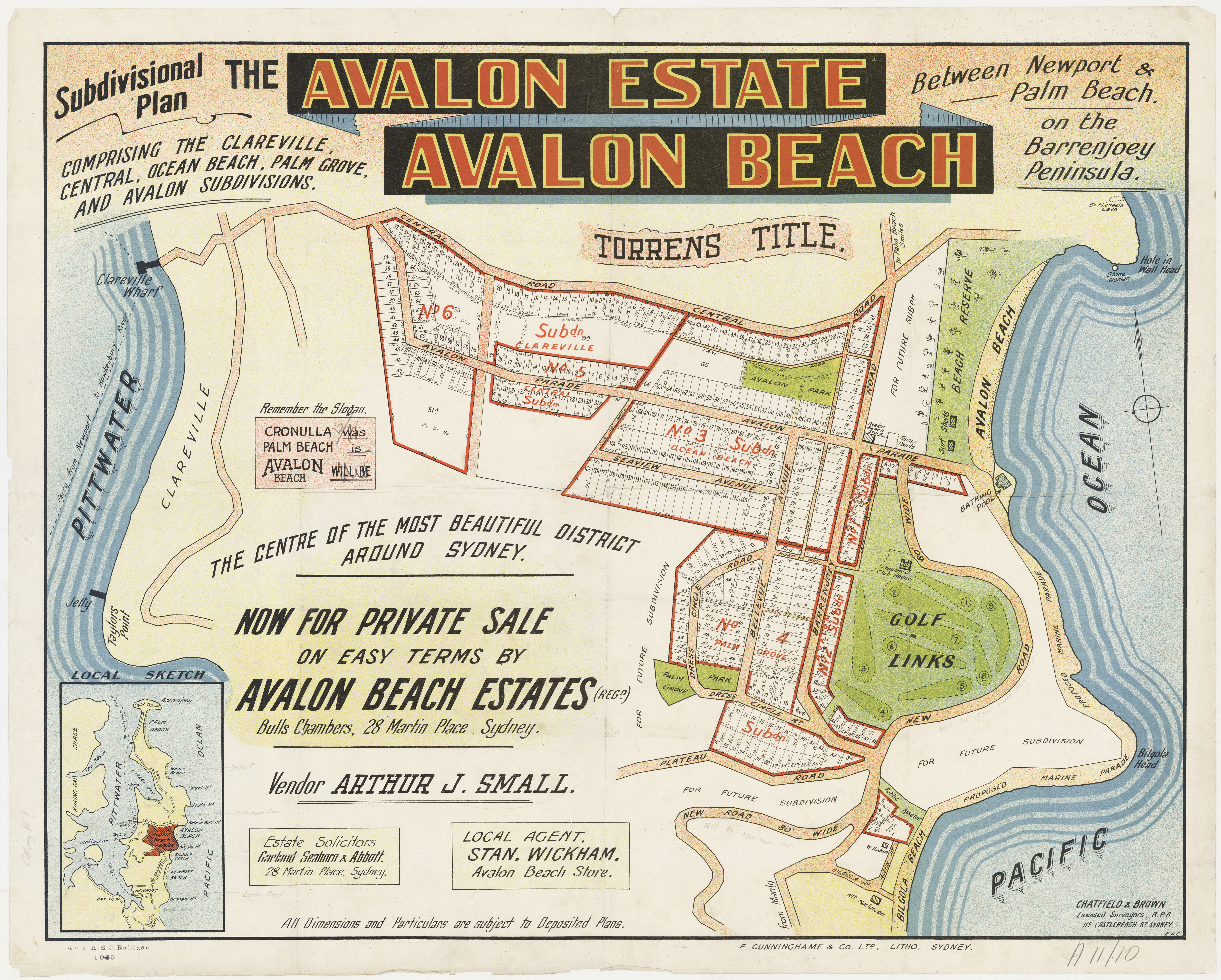 Arthur Jabez Small acquired 35 acres, 2 rood, 20 and 3/4 perches, the bulk of the residue of the estate, on December 10th, 1924. These lots are seen in The Avalon Estate, Avalon Beach lithographs from that same year onwards: