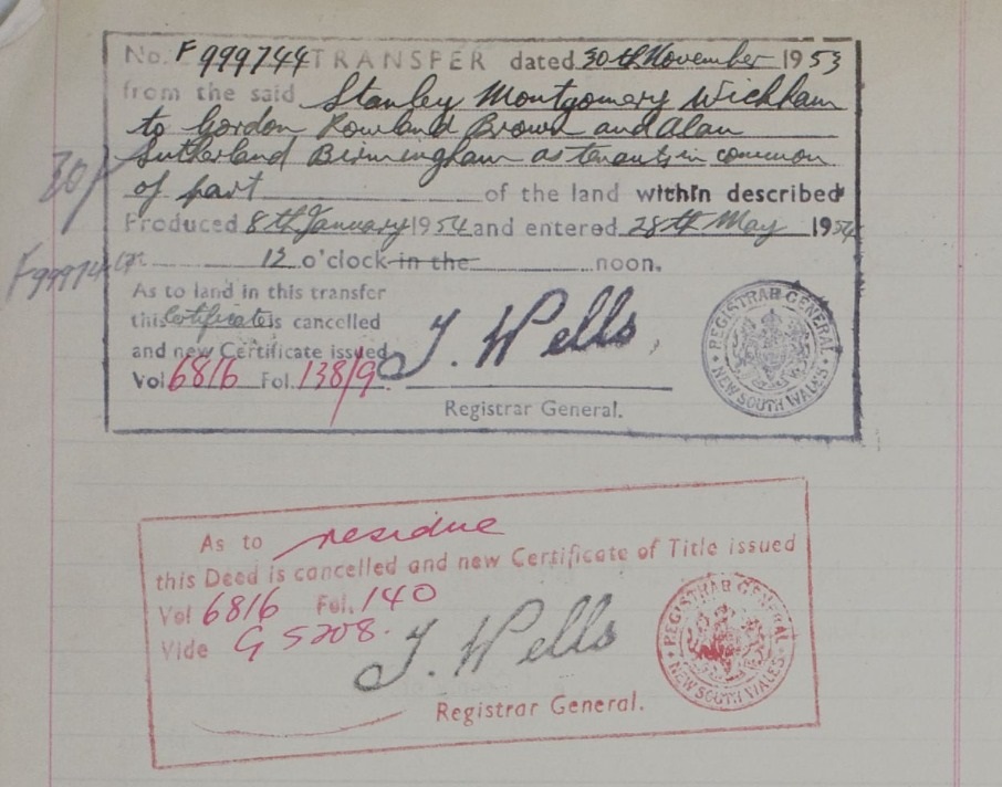 Lot 12 (Volume 4620 Folio 100) was sold on February 22nd 1934 to Stanley Montgomery Wickham. On February 28th, 1934 he took out a Mortgage which was to Rachel Simpson, widow, of Rose Bay. This was discharged on January 20th, 1943.