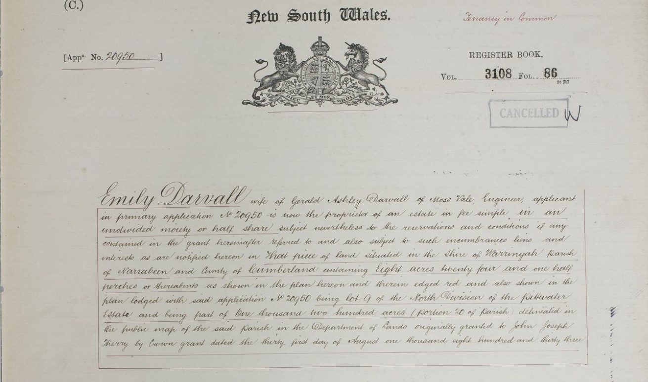 Vol. 4,515, Fol 117. Registered proprietor: Maria Ethel Simons. Land: Lots 11 and 12, deposited plan 14,884, at Careel Bay, ph. Narrabeen.