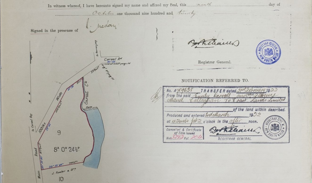 Previous Vol-Fol of this section of Careel Bay-Avalon-Clareville in Vol-Fol: 4404-193 and was Lots 8 to 12 near Shore Brace bought by William Angus, Builder, of Sydney.
