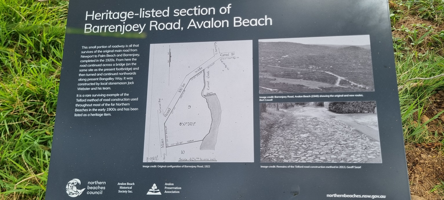 Another local historical curiosity presented at an ABHS Meeting in 2021 is the remaining "cobblestone" section of the original Barrenjoey Road route at North Avalon. The road took a shape right just south of where North Avalon Rd is now to cross Careel Creek then continued north along present Bangalley Way. The remaining piece of the original construction method is listed as a heritage item in the Pittwater LEP and was a larger section, until the Northern Beaches Council tarred it without consultation.