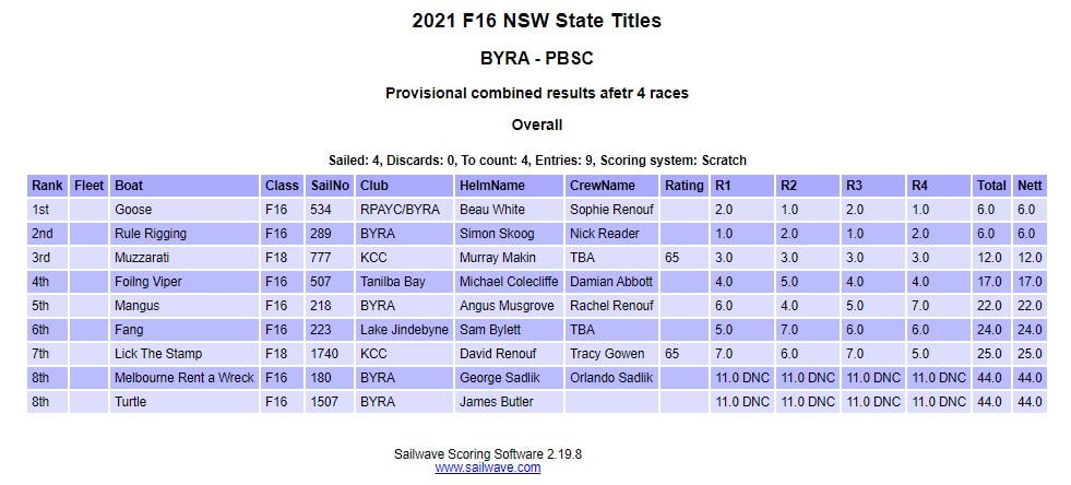 NSW State Titles provisional results after 4 races on Friday 26 Feb, 2021