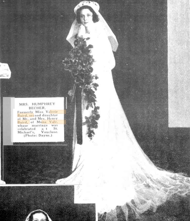 Mrs. Humphrey Beccher and Mrs. Bill Wentworth, who are staying with their mother, Mrs. H. S. Baird, at Mona Vale ...WHO GOES WHERE.. (1942, January 4). The Sun (Sydney, NSW : 1910 - 1954), p. 8. Retrieved from http://nla.gov.au/nla.news-article231766179