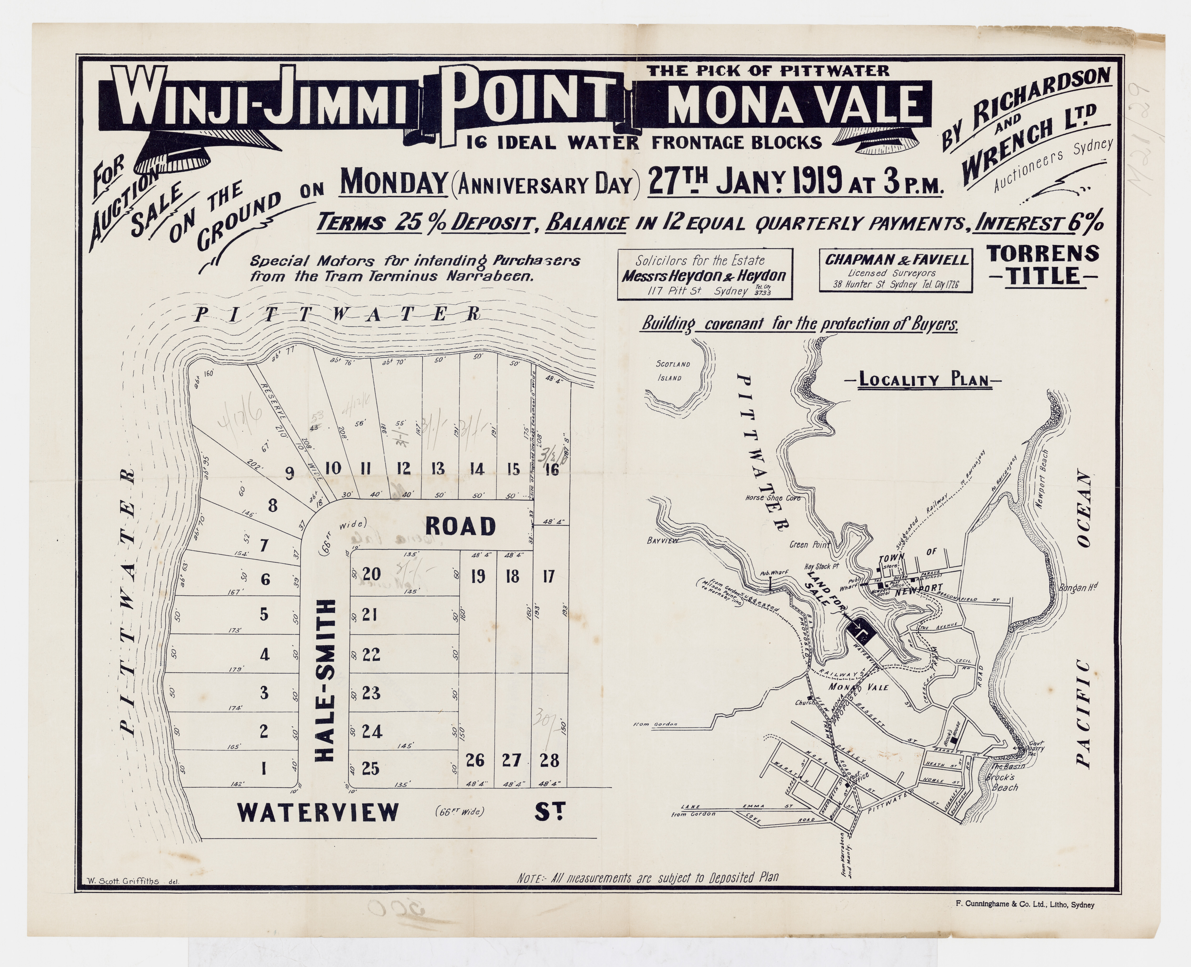 Warringah Shire Council records show: Winji Jimmi subdivision 3/1/1919: Heydon & Heydon forwarding cheque for £160 for Winji Jimmi Subdivision road. Council resolved; that the writers be informed that the Council is prepared to carry out the work in accordance with the letter so far as the money will go, but that it will probably not be able to start the work before the 26th instant and that it will not object to the selling of the allotments before the subdivision road is constructed. It was decided to suggest the new road be named Hale-Smith Street.