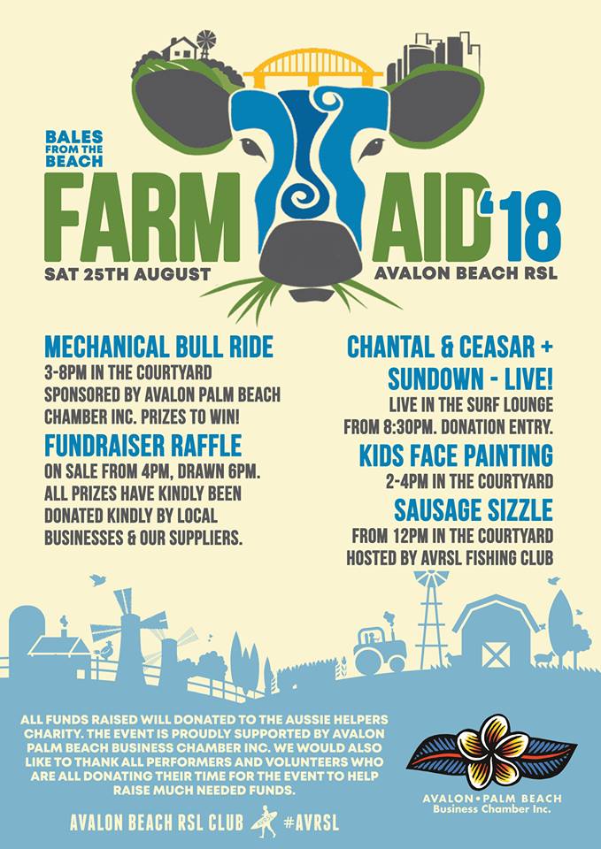 The 'Bales from the Beach' wasn't enough though - so next Saturday, August 25th, FARM AID will be happening at the Avalon Beach RSL Club.
