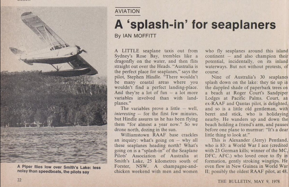 It appears that the floatplane operation, I conducted from the Myall River a few weeks ago, was newsworthy enough to make the Newcastle Herald. The local correspondent of this Newspaper (The Herald), does not check the facts. The report stated together with items of less concern, that a trawler had been forced to swerve to avoid a collision. At no time did any craft of any sort have to take avoiding action. At no time was a landing or take-off carried out with any craft manoeuvring on the water way, and on some occasions, I delayed five or ten minutes, to ensure a clear run. There were reputable people observing every takeoff and every landing from the shore. Moreover, I asked all persons I met, for their opinions, regarding the flights and not one made a criticism, in fact they were unanimously enthusiastic. Now, if there were residents who objected, who were they, and to whom did they object?