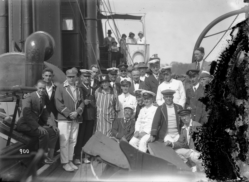 Committee members of the Pittwater Regatta on board SS ARCHER - Mrs Grieg can be seen in spiffy hat, John Roche peeking out behind Mr F. J. S. Young. 1925 Regatta, courtesy Australian National Maritime Museum photo No.: 10666. Archer was flagship in 1923 - the rowing cap worn by man third from left with white pants states 'NSW 1925'