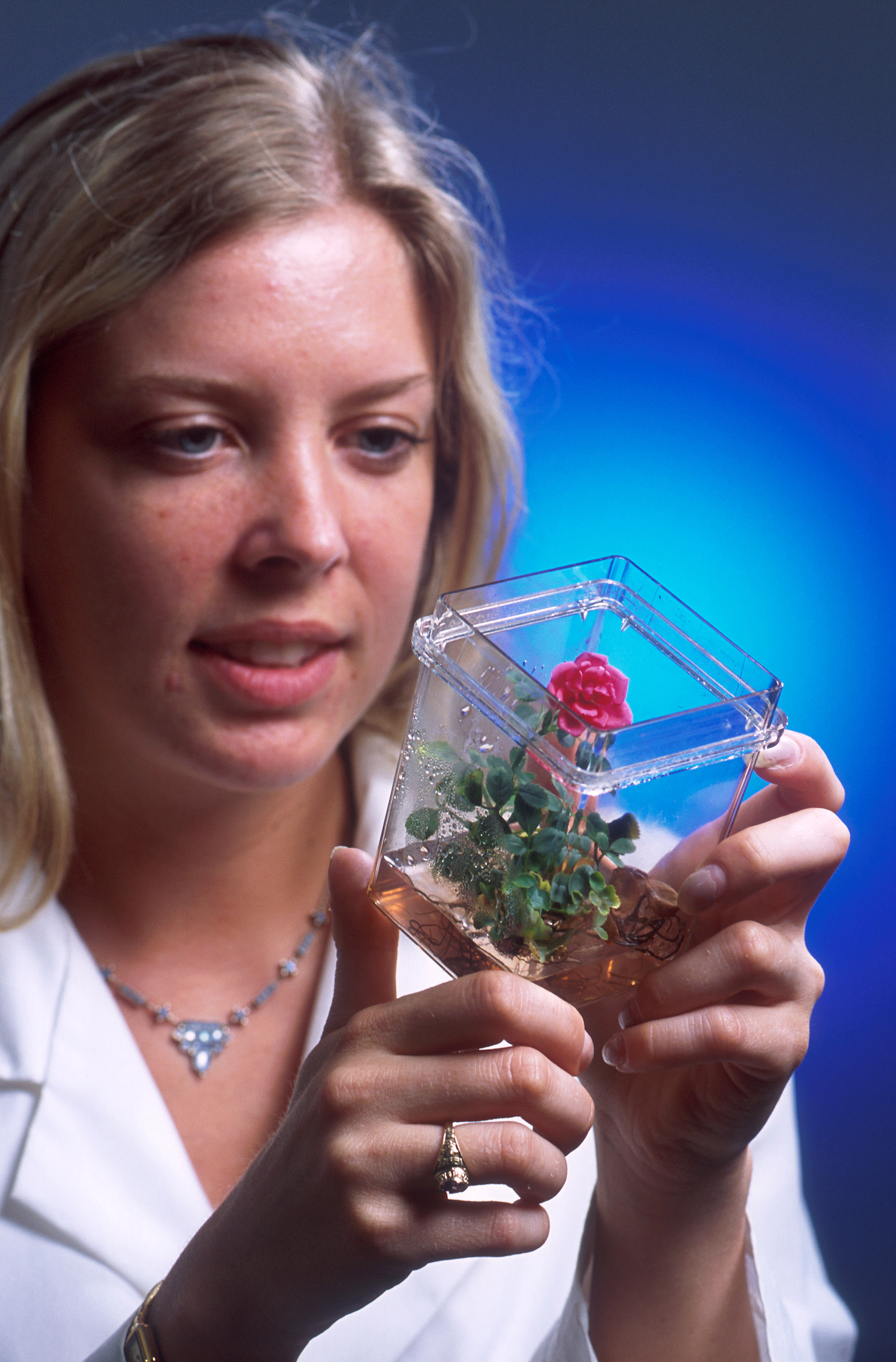 Technician Brandy Jones examines a rose plant that began as cells grown in a tissue culture. Image: This image was released by the Agricultural Research Service, the research agency of the United States Department of Agriculture, with the ID K9608-1