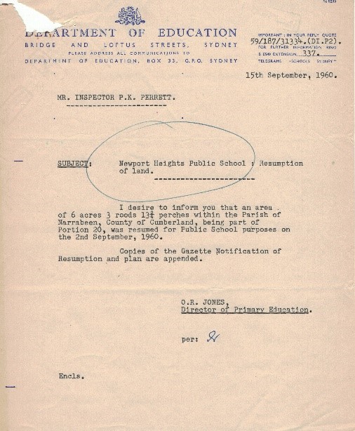 Letter 15 Sep, 1960 – Newport Height Public School: Resumption of Land; And Map 12.8.60