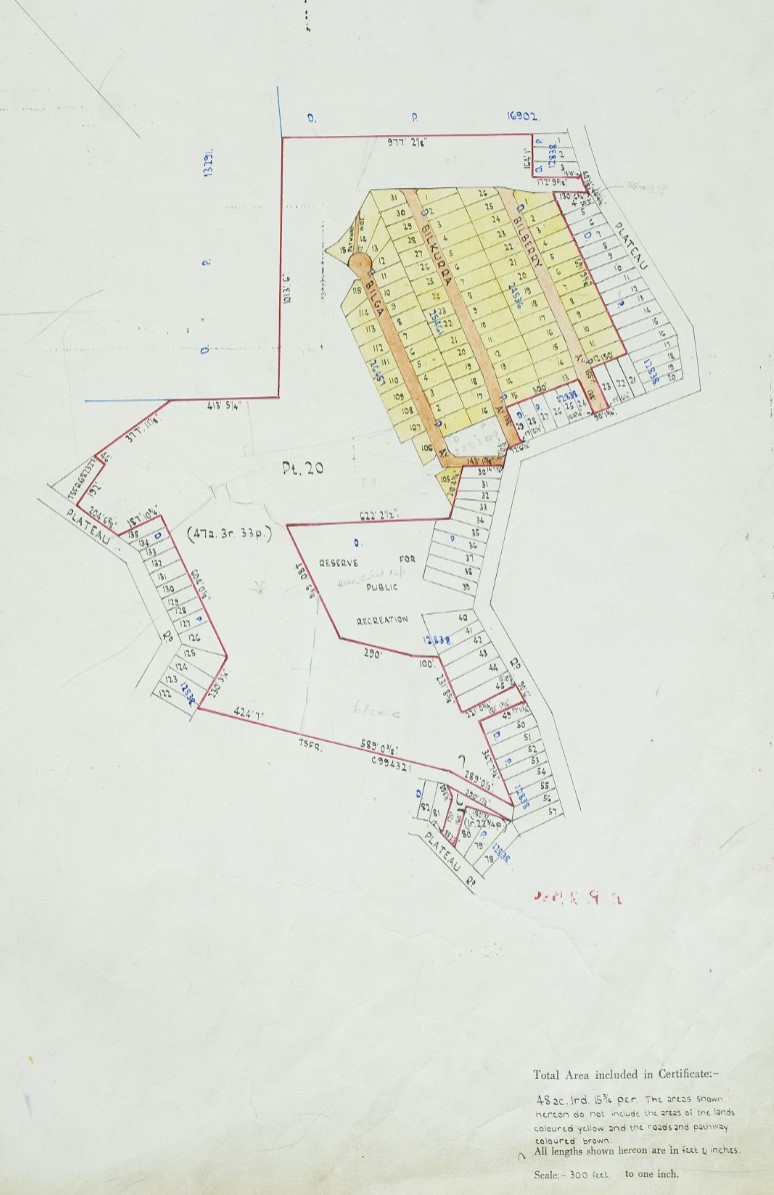 All that piece or parcel of land situate in the Shire of Warringah, parish of Narrabeen and county of Cumberland, being part of the land comprised in Certificate of Title, volume 7,148, folio 94 and also being part of portion 20: Commencing at a point in a north-western side of Plateau-road being also the north-eastern extremity of a south-eastern boundary of lot 45 in deposited plan 12,838; and bounded thence on part of the south-east by that side of that road bearing 190 degrees 47 minutes 30 seconds, 90 feet 6 inches to the south-eastern extremity of a north-eastern boundary of lot 49 in said deposited plan 12,838; on parts of the southwest by the said and another, north-eastern boundary of that lot bearing successively 329 degrees 18 minutes 30 seconds, 17 feet 111 inches and 287 degrees 49 minutes 30 seconds, 181 feet If inches; again on the south-east by the northwestern boundaries of lots 49 to 55 inclusive in said deposited plan 12,838 bearing 197 degrees 49 minutes 30 seconds, 347 feet 7 ½ inches; again on parts of the south-west by northeastern boundaries and part of a north-eastern boundary of lot 7 in deposited plan 28,117 bearing successively 335 degrees 45 minutes 40 seconds, 289 feet 0£ inch 324 degrees 43 minutes 30 seconds, 589 feet 0 inches and 324 degrees 47 minutes 30 seconds, 40 feet; on part of the north-west by a line bearing 54 degrees 30 minutes 10 seconds, 530 feet Of inch to a point in the north-western boundary of a Reserve for Public Recreation of 5 acres 0 roods 211 perches, as shown in said deposited plan 12,838; again on the south-east and on parts of the north-east by the said north-western and by southwestern boundaries of that Reserve bearing successively 197 degrees 49 minutes 30 seconds, 198 feet, 144 degrees 43 minutes 30 seconds 290 feet and 107 degrees 49 minutes 30 seconds, 100 feet; again on the south-east by the north-western boundaries of lots 42 to 45 inclusive in said deposited plan 12,838 bearing 197 degrees 49 minutes 30 seconds, 231 feet 8 1/2 inches; again on the north-east by the south-western boundary of said lot 45 bearing 107 degrees 49 minutes 30 seconds, 221 feet 05 inches; and again on the north-west by the said south-eastern boundary of that lot bearing 59 degrees 18 minutes 30 seconds, 15 feet 10 1/2inches to the point of commencement; having an area of 6 acres 3 roods 13 ½ perches or thereabouts and said to be in the possession of Bilgola Plateau Pty. Limited. (833) NOTIFICATION OF RESUMPTION OF LAND UNDER THE PUBLIC WORKS ACT, 1912, AS AMENDED (1960, September 2). Government Gazette of the State of New South Wales (Sydney, NSW : 1901 - 2001), p. 2764. Retrieved from http://nla.gov.au/nla.news-article220315750